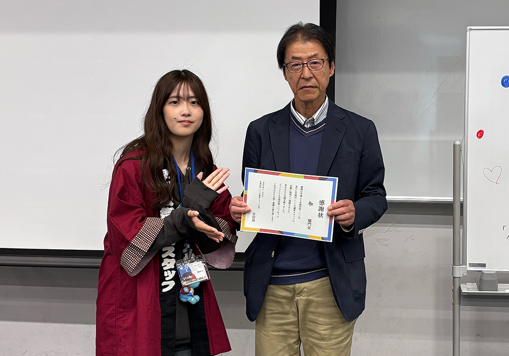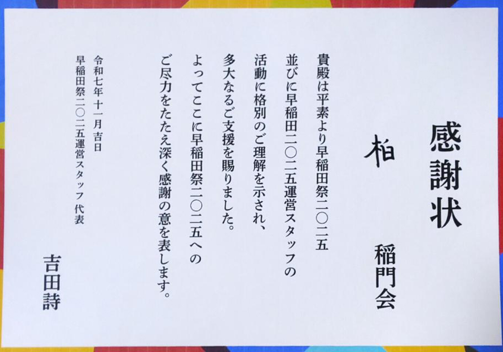柏稲門会では昨年7月の総会に出席した早稲田祭2025運営スタッフに寄付を行いましたが、その支援に対し感謝状が贈呈されました。